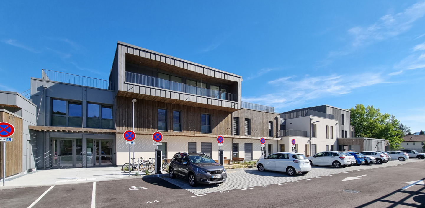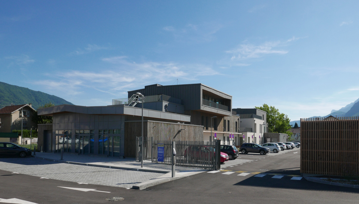 L’ensemble du projet est conçu au départ comme un empilement des volumes des modules (construction hors site) qui une foi assemblés distinguent 3 éléments significatifs : la salle polyvalente, les salles de réunion et le logement du gardien. Ces trois éléments clés du programme sont mis en valeur par le traitement architectural de la ligne de toiture (lignes brisées en rappel du profil des chaines montagneuses voisines).