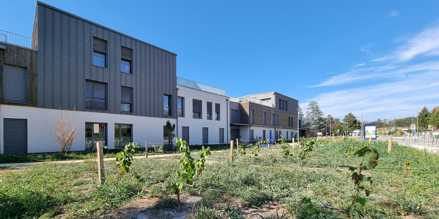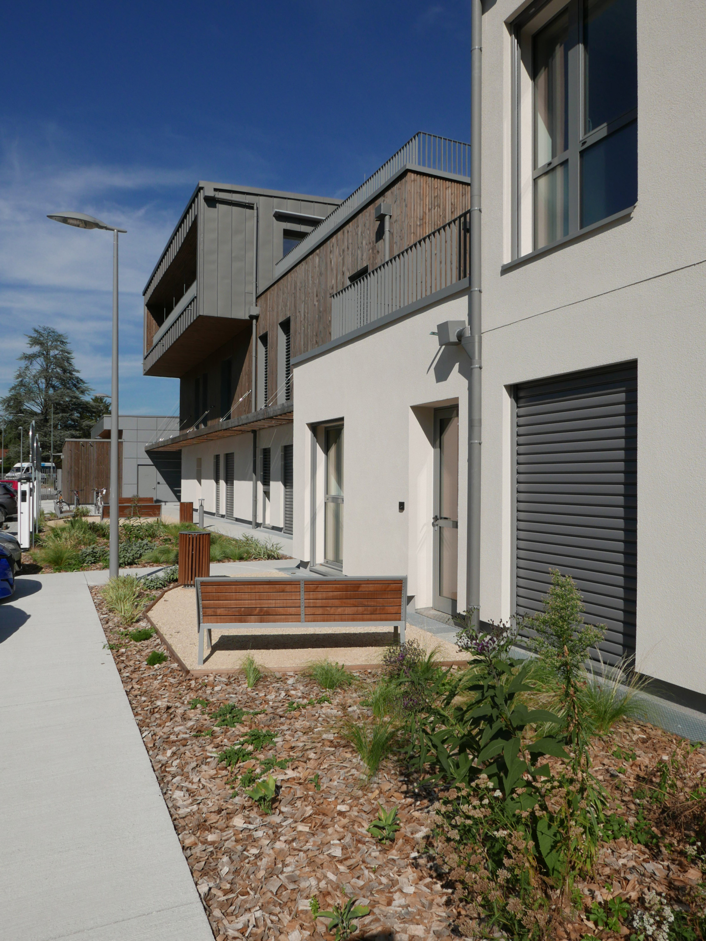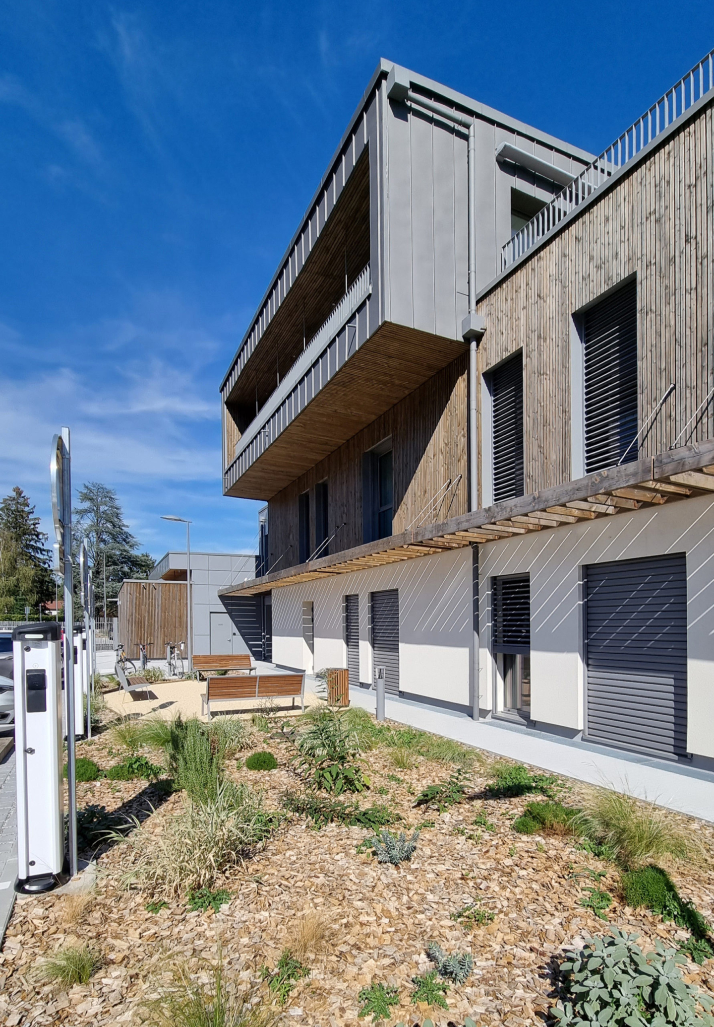 L’écriture architecturale s’inspire volontairement des formes rectangulaires issues des modules préfabriqués en usine. Les nombreuses ouvertures sur le grand paysage, la maîtrise de la lumière naturelle, les espaces extérieurs paysagés, sont autant de points participant au confort de vie des employés et des usagers.